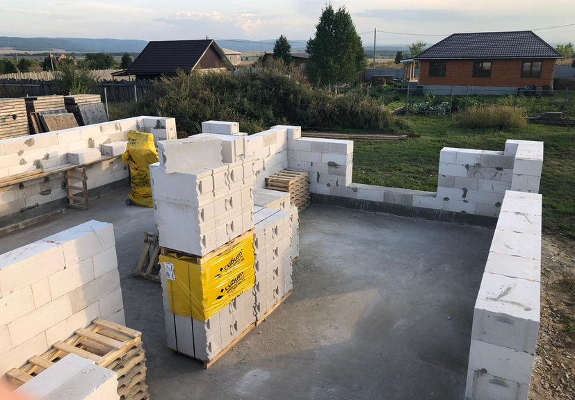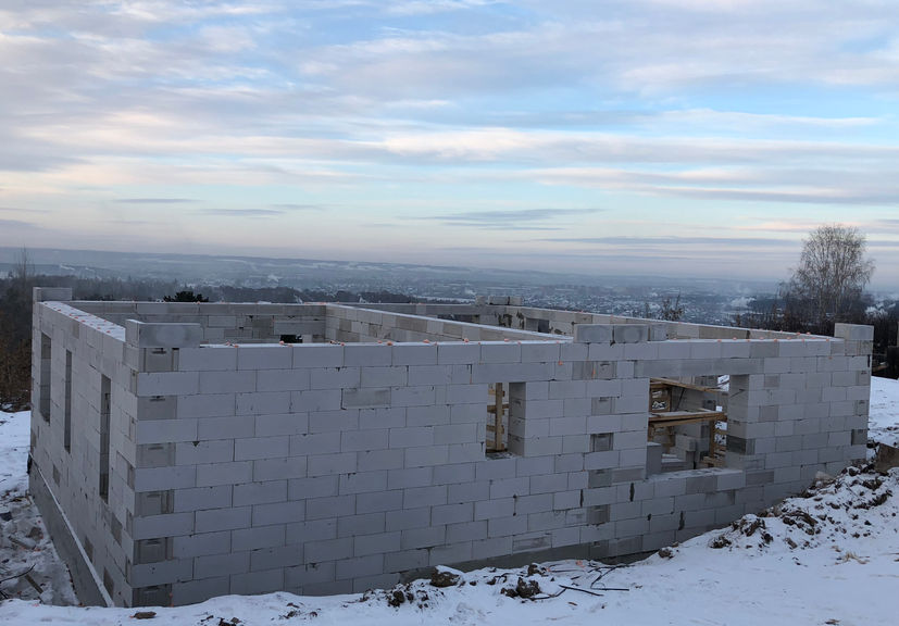 Ноябрь 2017 г. Закончена кладка стен. Цоколь - ФБС, перекрыт по бетонному армированному поясу ЖБ плитами; Первый этаж - блоки из автоклавного газобетона (толщина стен 400 мм) D400/B2.0 перекрыт по бетонному армированному поясу ЖБ плитами; - второй этаж ( на фото третий) - блоки из автоклавного газобетона (толщина стен 400 мм) 400/B2.0 и верхний бетонный армированный пояс с закладными элементами для крепления кровли к стенам.